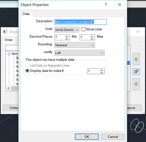 Now we see that there is indeed an XYZ point and my CustomData field is reporting a value. Unlike the other 2 forms of collecting information, VLA and COD, we also have direct control of the DXF output precision. We can do this by using the “Edit Object Properties” button located between the Up/Down arrows of the List Setup dialog box. If you look at the image below, you will see that I have changed my Minimum and Maximum values to be 7 decimal places; the default is 3 decimal places. It would appear as though 7 decimal places is the limit the software will give us, but that has been more than sufficient to suit all of my needs. Honestly, 5 decimal places would probably be fine for the majority of us BIM dogmatic types. In addition to letting us change precision of output, this dialog also lets us regulate items that could have multiple indexes. Some examples of this would be Custom Data, Dimensions and Connectors.